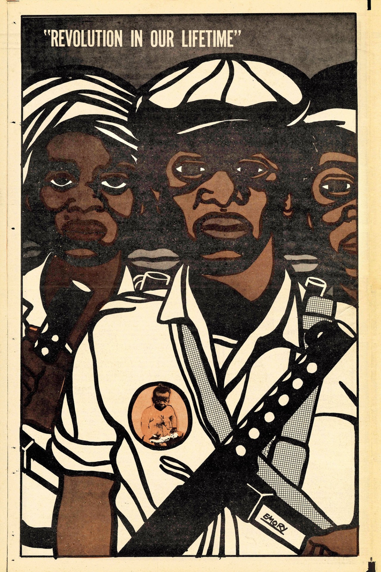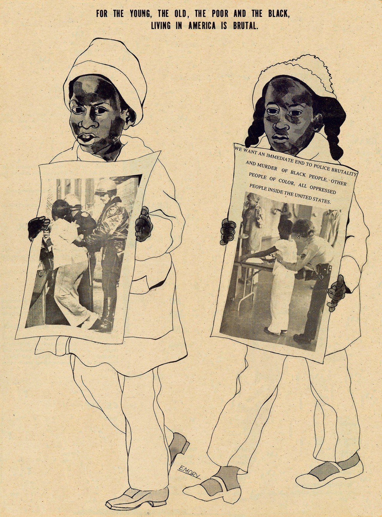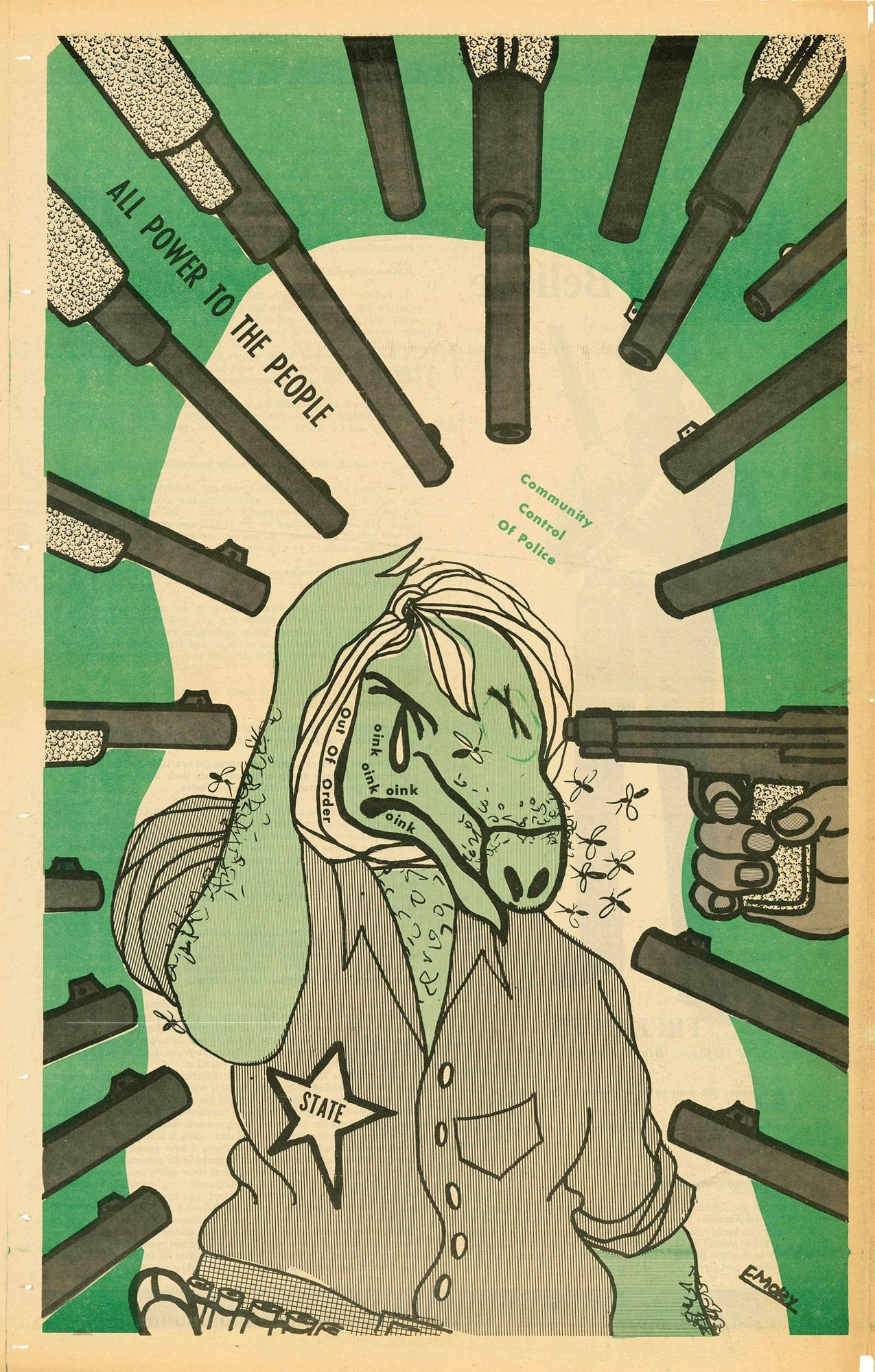 Emory Douglas was born in Grand Rapids, Michigan in 1943. His family moved to Oakland when he was eight due for health reasons and a better climate. After some trouble with the law Emory spent 15 months at the Youth Training School in Ontario, California working in the print shop. This provided the basic training in typography, illustration and logo design. Later he enrolled at City College of San Francisco and it was there he began to explore the combination of art and message.